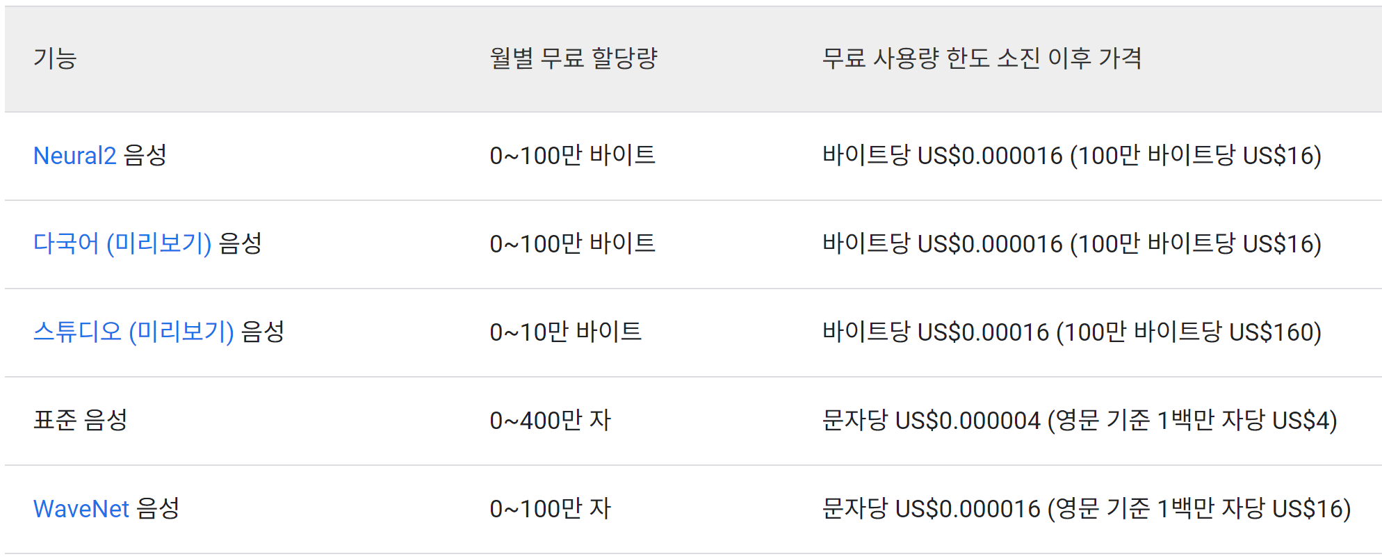 아래는 요금정책 및 무료사용량에 대한 가격표입니다.