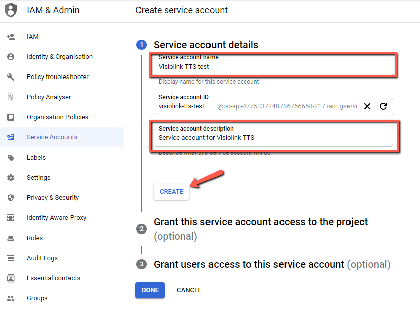 10. 서비스 계정에 쉽게 식별할 수 있는 이름과 설명을 입력하고 "생성(CREATE)"을 선택하세요.