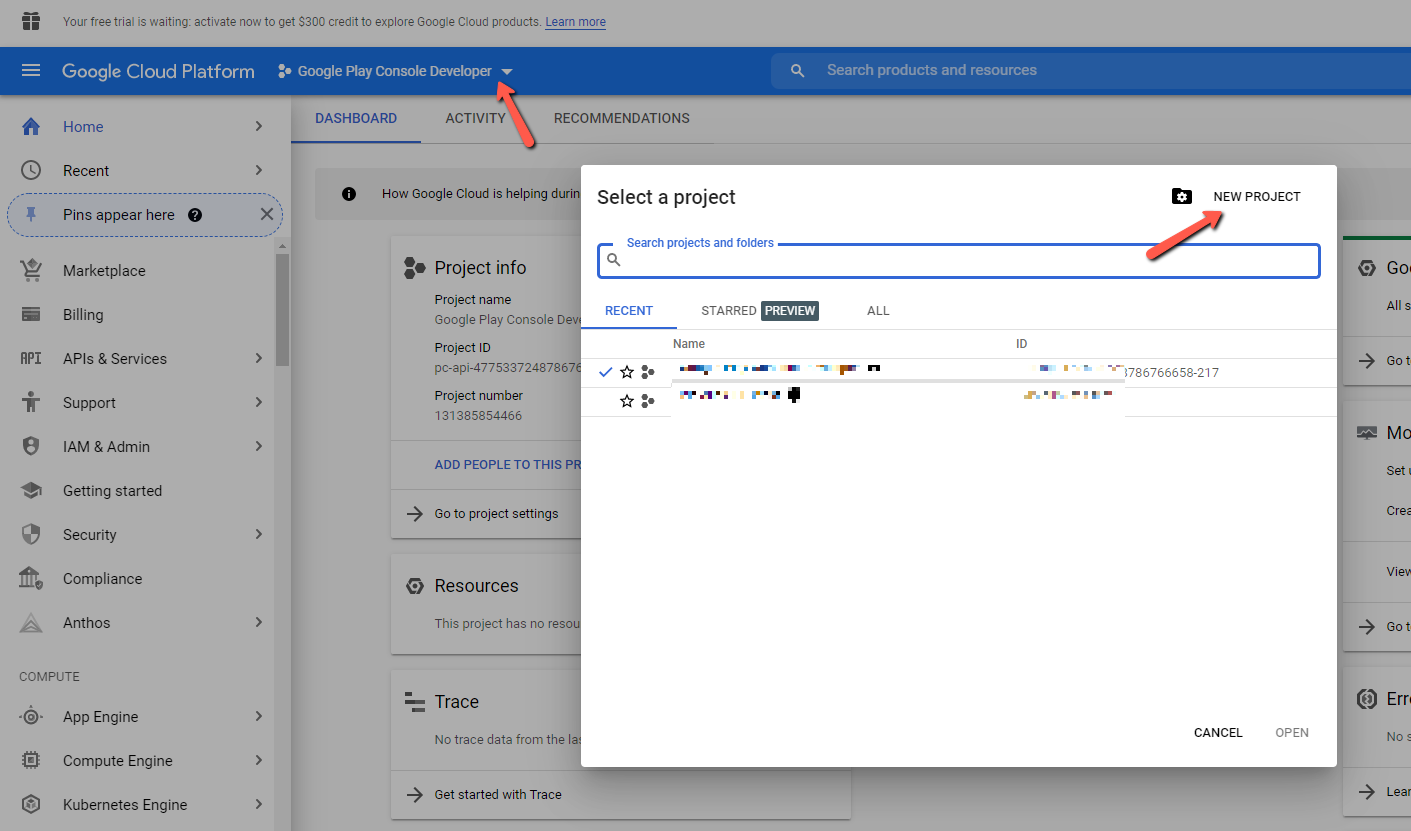 6. 올바른 프로젝트가 선택되었는지 확인하고 "활성화(ENABLE)"를 클릭하세요.