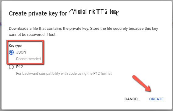 13. "JSON"을 선택하고 "생성(CREATE)"을 클릭하세요. 파일이 다운로드됩니다.