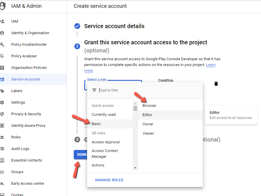 11. 역할을 선택하세요: 편집자(Editor) (Basic -> 편집자(Editor)), 그리고 "완료(DONE)"를 클릭하세요.