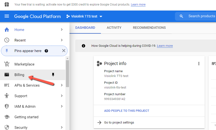4. 결제로 이동하여 신용카드나 유사한 결제 수단을 프로젝트에 연결하세요. 단계에 따라 진행하세요.
