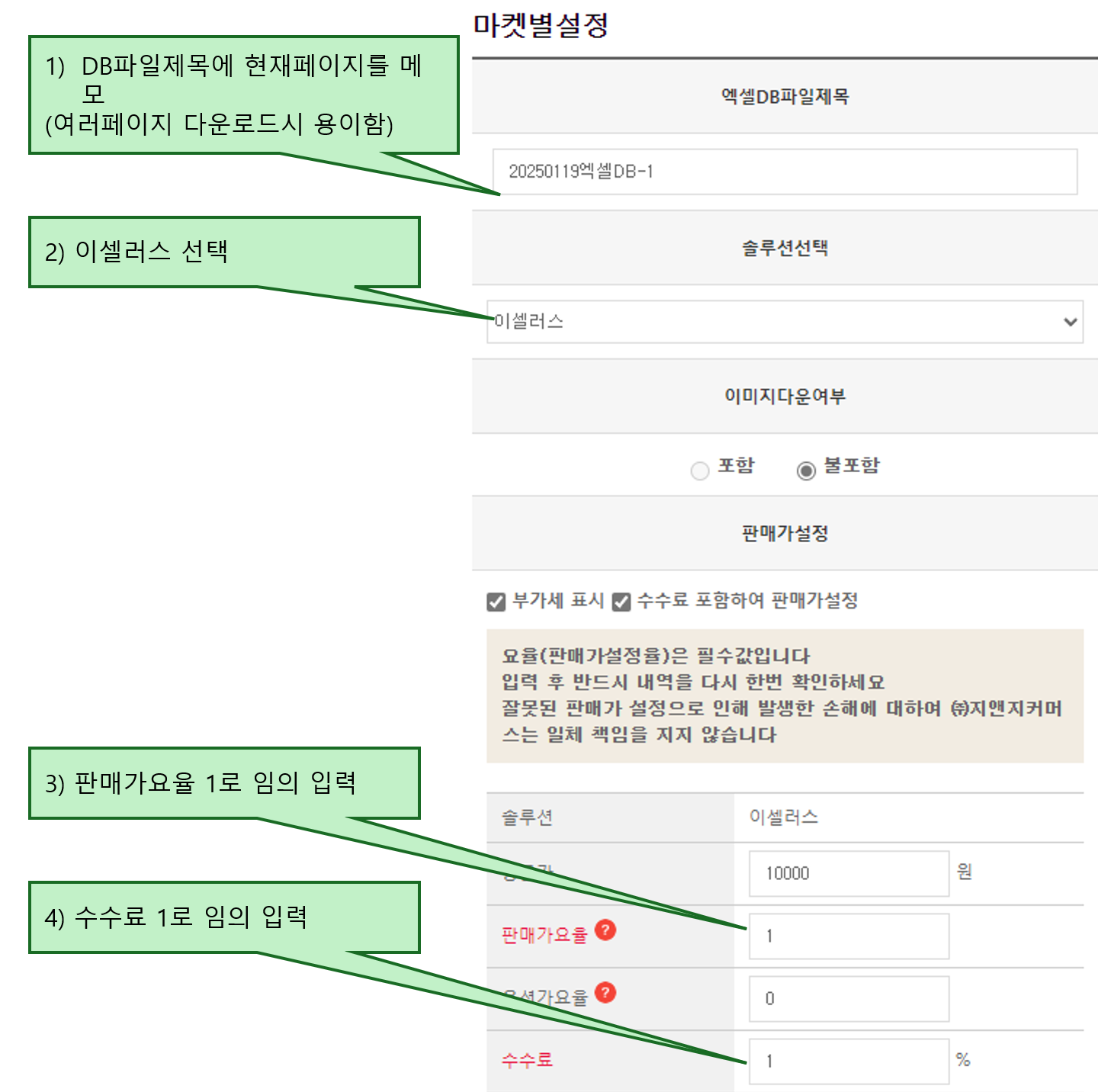 판매가요율, 수수료는 오토몬스터에서 무시하는 내용이므로 그냥 1로 설정해주세요.