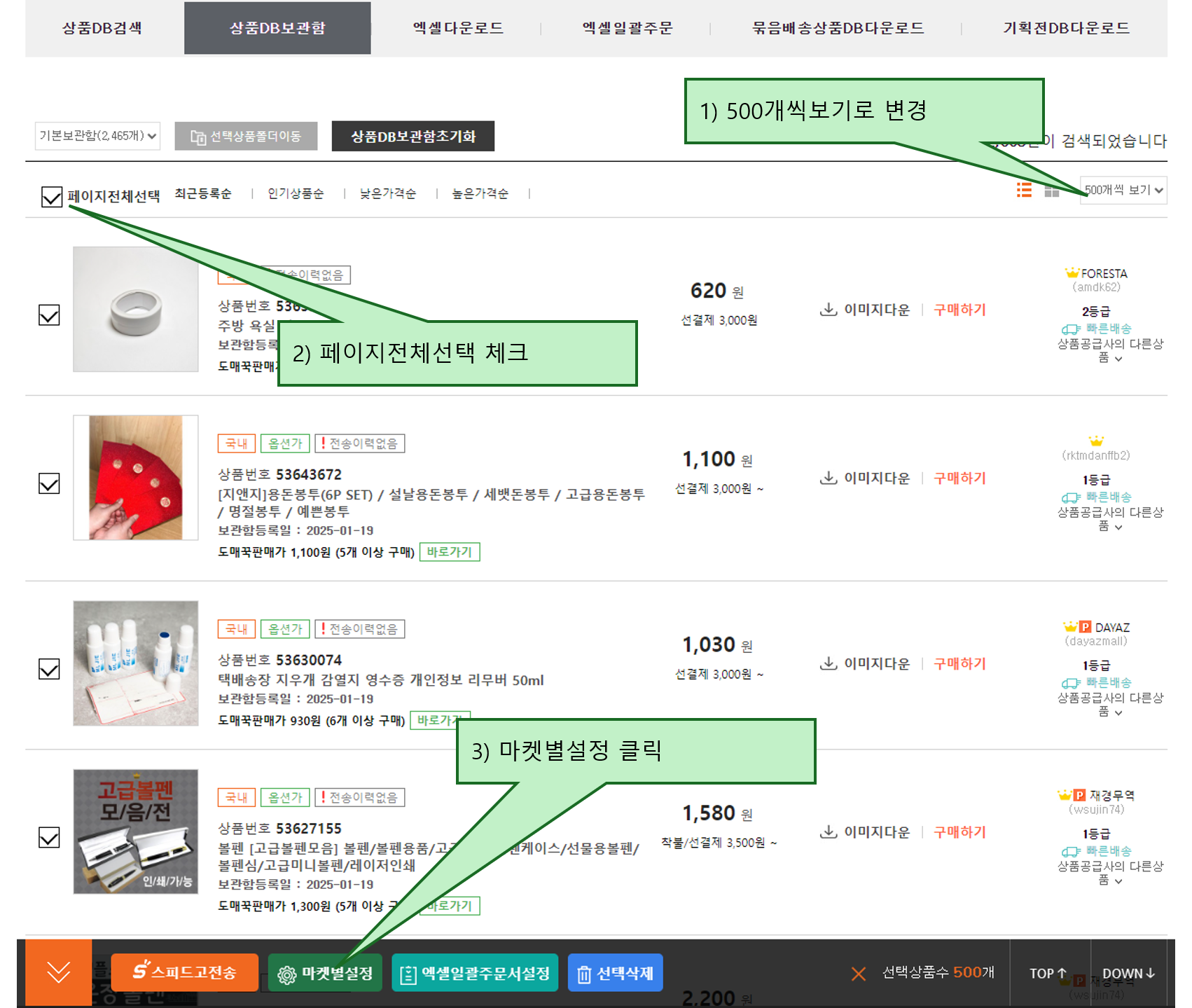 상품DB보관함으로 500개씩 보기.