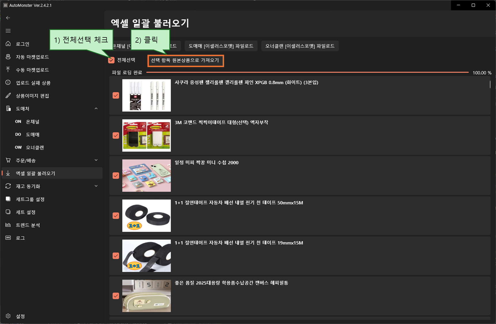 모든항목을 오토몬스터로 가져왔으면(진행률 100%), 자동 마켓 업로드 페이지로 이동합니다.