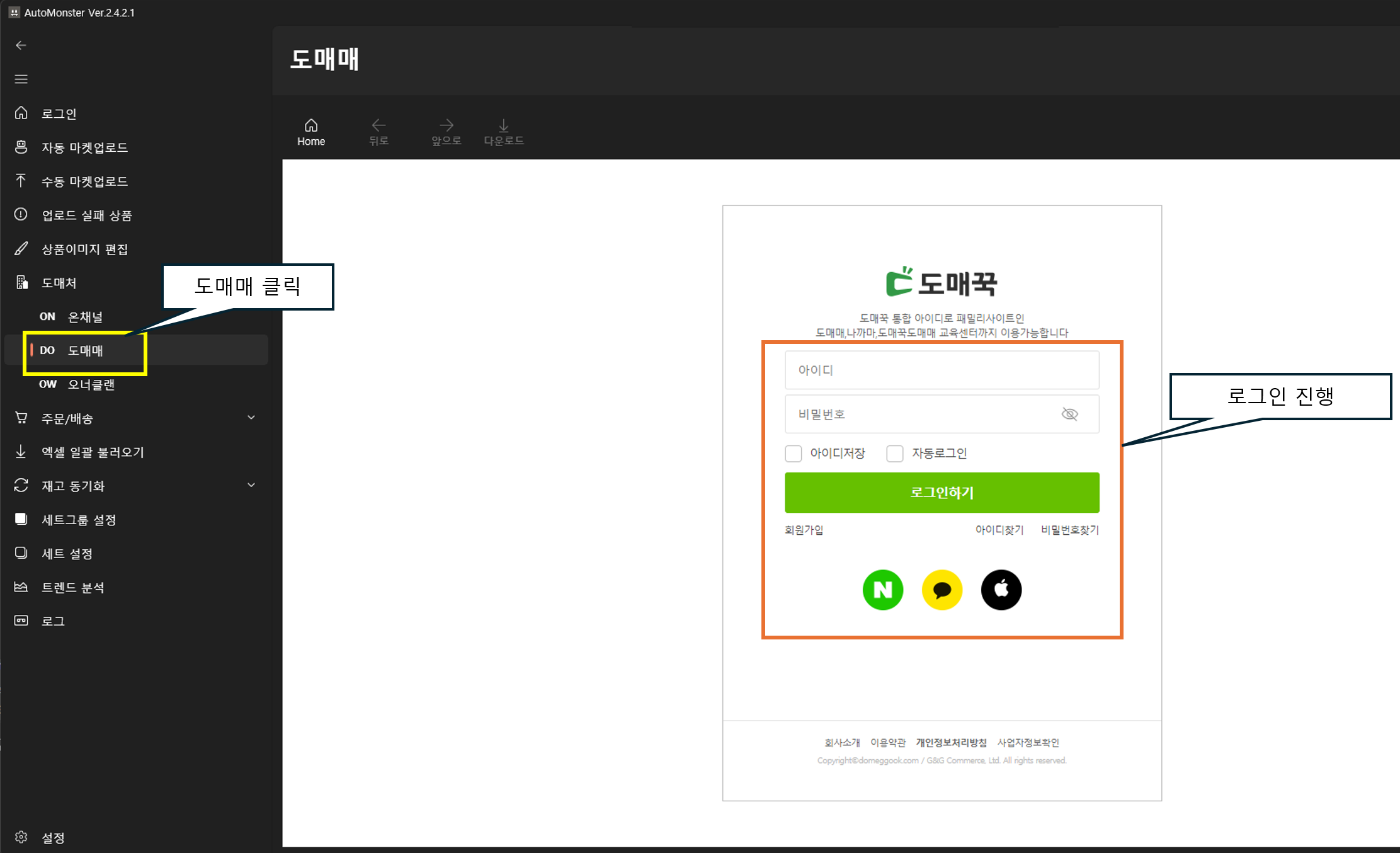 도매매를 클릭하여 페이지 이동후, 로그인을 진행합니다.