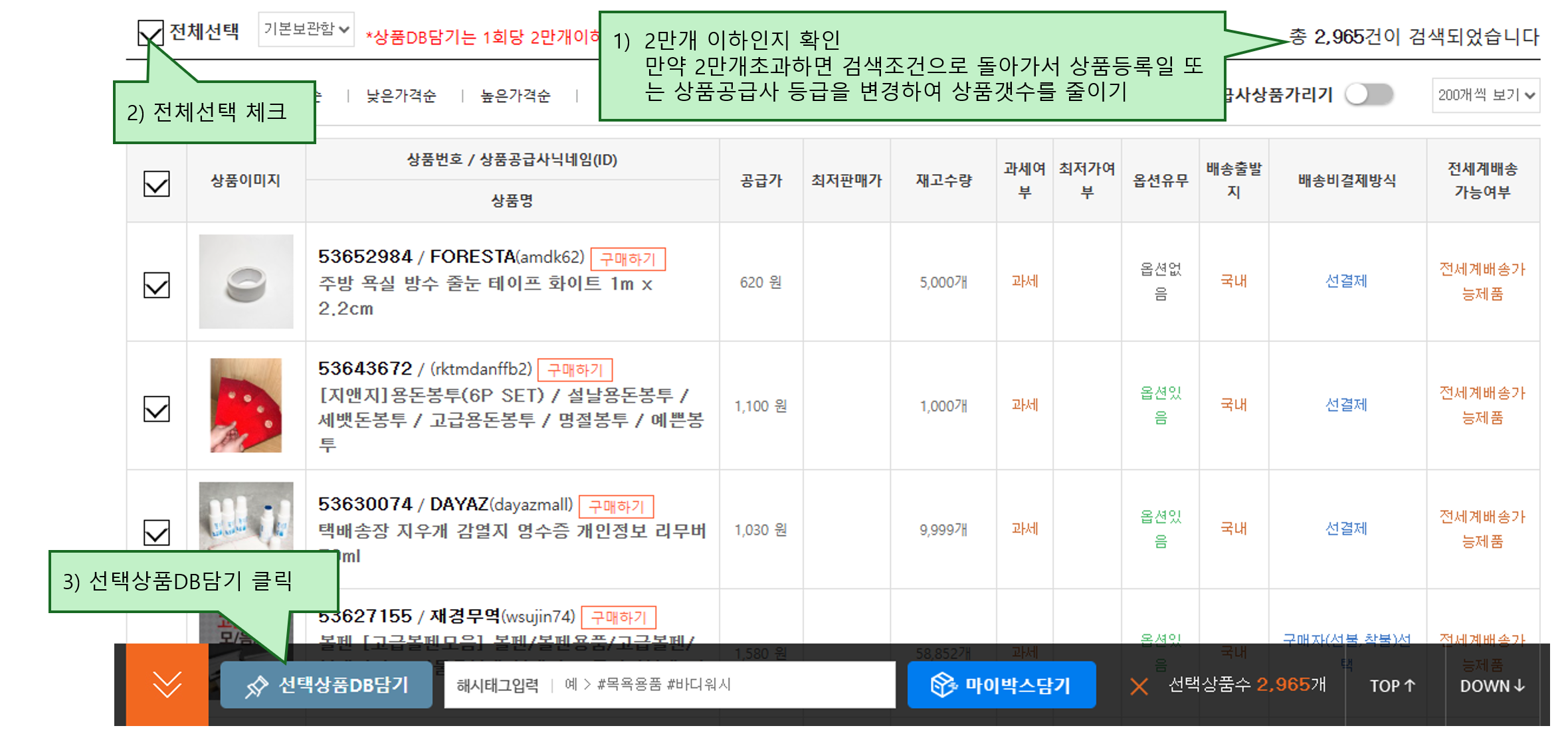 이후 '전체선택'을 체크하고 '선택상품DB담기'를 클릭해주세요.