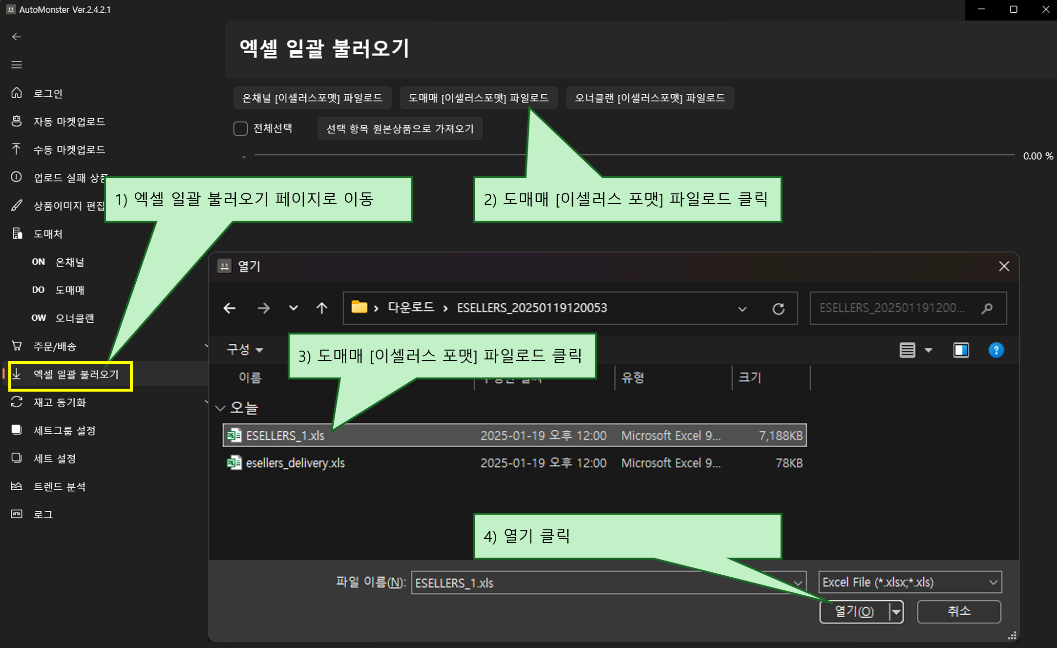 도매매[이셀러스] 파일로드 클릭하고 아까 압축 풀었던 파일중 ESELLERS_1.xls 파일을 선택합니다.