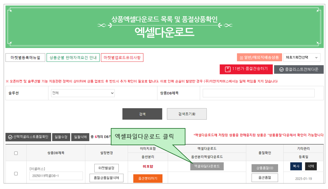 방금전 생성했던 상품DB제목을 확인하여 우측에 '엑셀파일다운로드' 버튼을 클릭합니다.