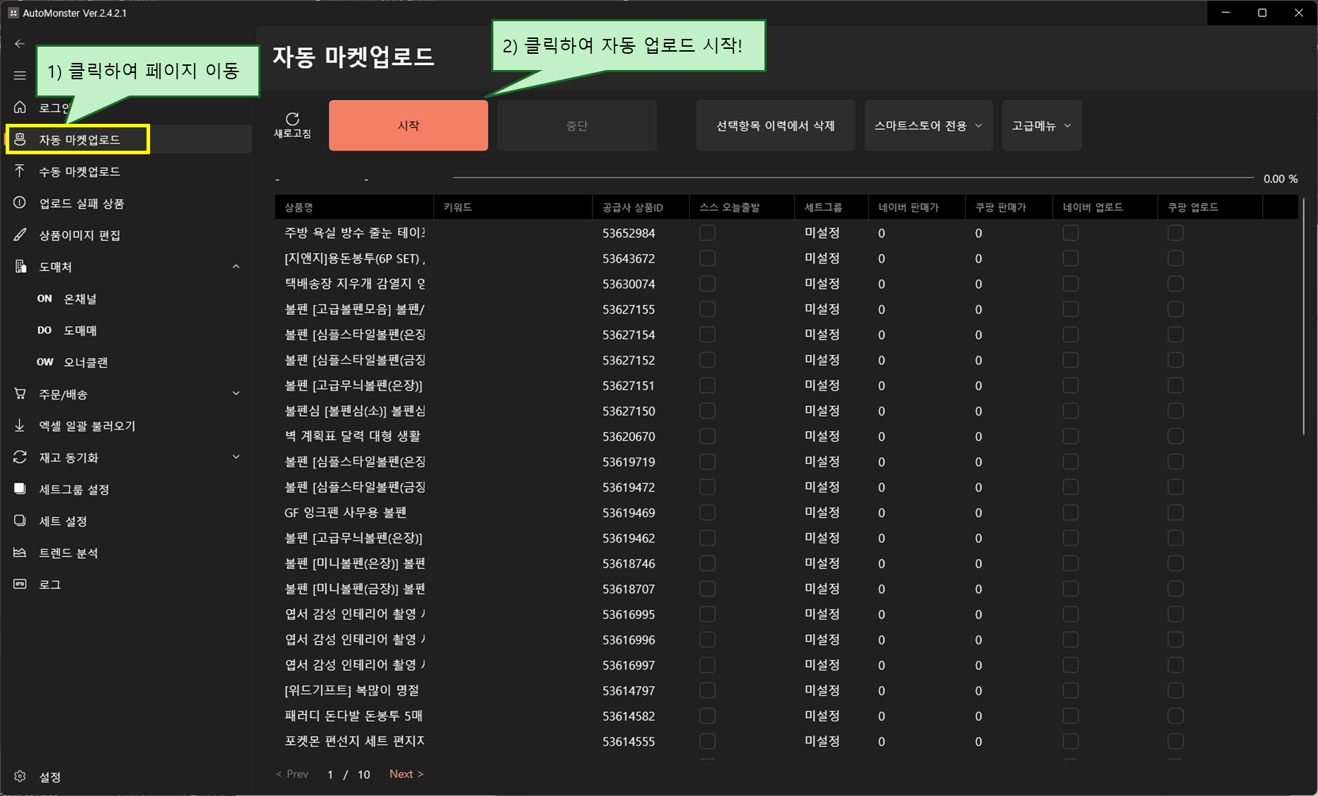 모든항목을 오토몬스터로 가져왔으면(진행률 100%), 자동 마켓 업로드 페이지로 이동합니다.