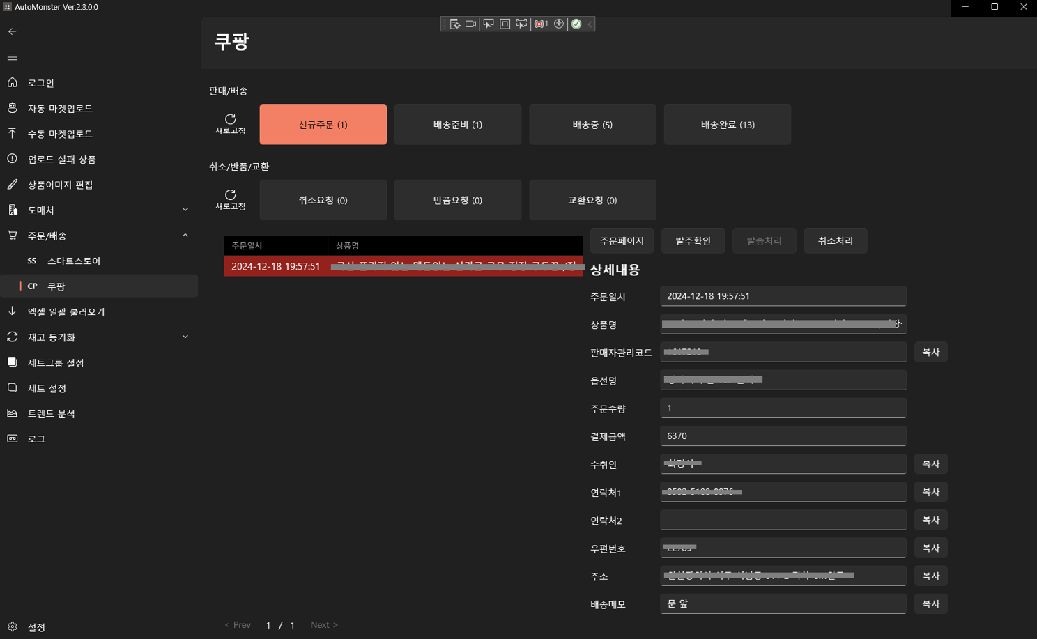 : 쿠팡, 스마트스토어 별로 신규주문 / 배송처리 / 교환 반품요청 확인 등이 가능합니다.