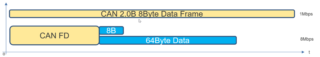 CAN-FD는 데이터 전송 속도가 최대 5Mbps까지 가능. 이는 기존의 CAN의 1Mbps에 비해 5배 이상 빠른 속도.