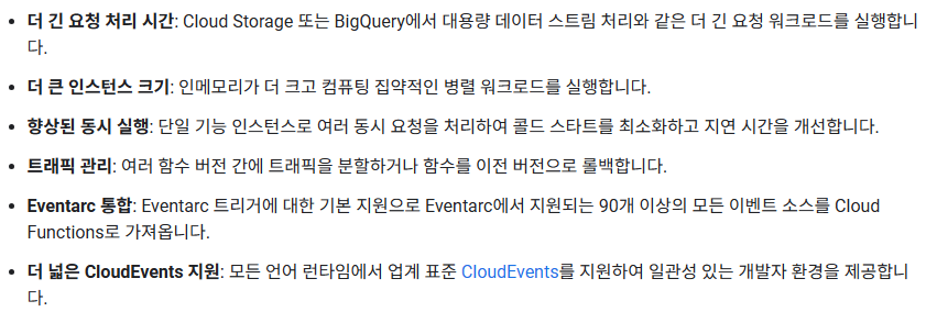2세대 Cloud Functions는 기본적으로 1세대보다 더 많은 기능과 유연성을 제공하며, 복잡한 애플리케이션과 워크로드에 더 적합합니다.