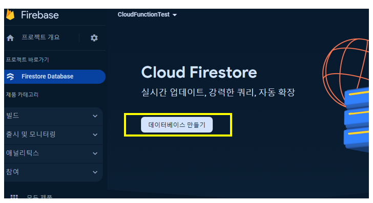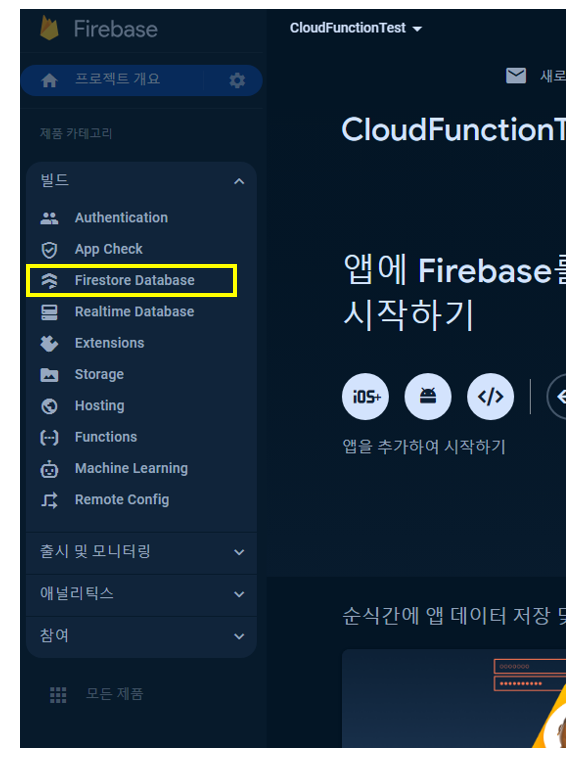 좌측 메뉴의 [빌드] 를 클릭하고 [Firestore Database] 를 클릭해주세요.