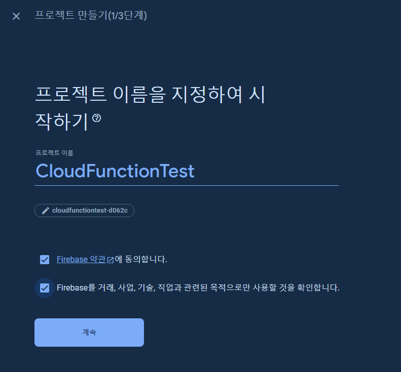 프로젝트 이름을 입력하고 체크란에 체크를 한 후, [계속] 버튼을 클릭해주세요.