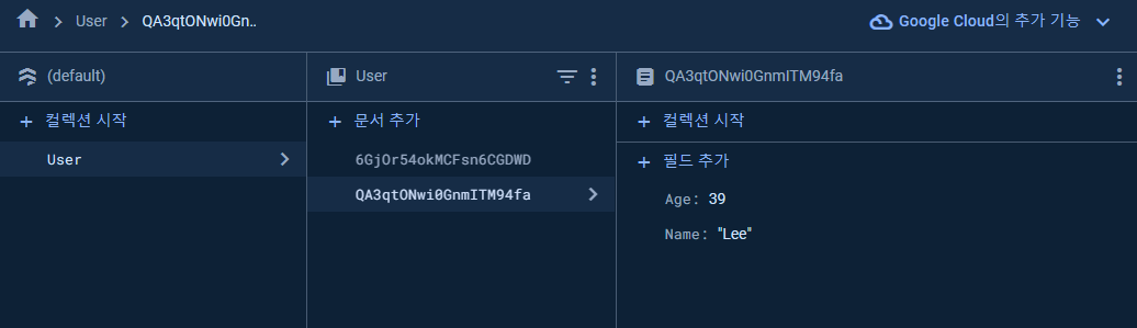 아래와 같이 User컬렉션을 만들고 User 2개 데이터를 추가하였습니다.