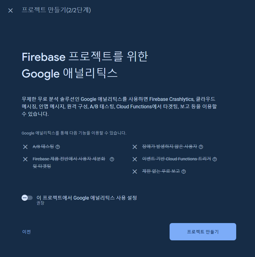 애널리틱스는 비즈니스측면에서 도움이 되는 기능이지만 지금 진행하는 예제에서는 사용하지 않도록 하겠습니다.