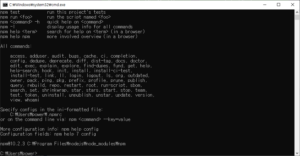 커맨드 프롬프트에서 npm을 입력후 엔터키를 눌러주세요.