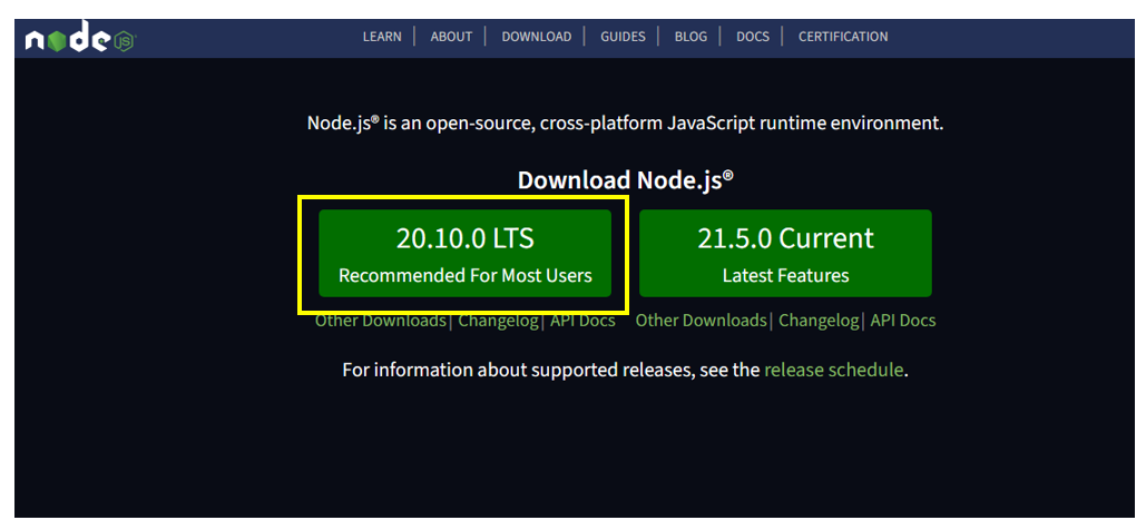 LTS를 클릭해주세요. LTS가 오랫동안 지원을 받을 수 있는 버젼이어서 추천합니다.