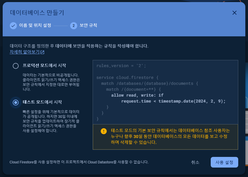 3) Firestore Database 생성